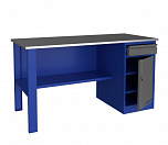 Однотумбовый. Допустимая нагрузка на столешницу 750 кг. Опорные элементы выполнены сварными из холоднокатаной стали. Верстак состоит из столешницы, поры, тумбы P4 с двумя малыми и двумя большими ящиками, полки-стенки и одинарного экрана с кронштейнами. Все металлические элементы покрыты полиэфирной порошковой краской. Столешница состоит из фанеры марки ФСФ толщиной 24 мм, которая покрыта лаком-антисептиком и листом оцинкованной холоднокатаной стали толщиной 1,2 мм. Размеры (ВхШхГ) 1470x1396x696 мм.