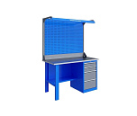 Однотумбовый. Допустимая нагрузка на столешницу 750 кг. Опорные элементы выполнены сварными из холоднокатаной стали. Верстак состоит из столешницы, опоры, тумбы P5 с четырьмя малыми и одним большим ящиком, полки-стенки, двойного экрана с кронштейнами и комплекта освещения. Столешница состоит из фанеры марки ФСФ толщиной 24 мм, которая покрыта лаком-антисептиком и листом оцинкованной холоднокатаной стали толщиной 1,2 мм. Размеры (ВхШхГ) 1965x1396x696 мм.