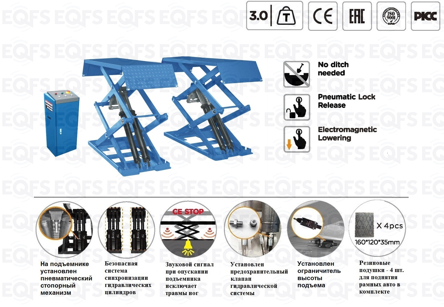 - Безопасная система синхронизации гидравлических цилиндров (автомобиль не упадет с подъемника)