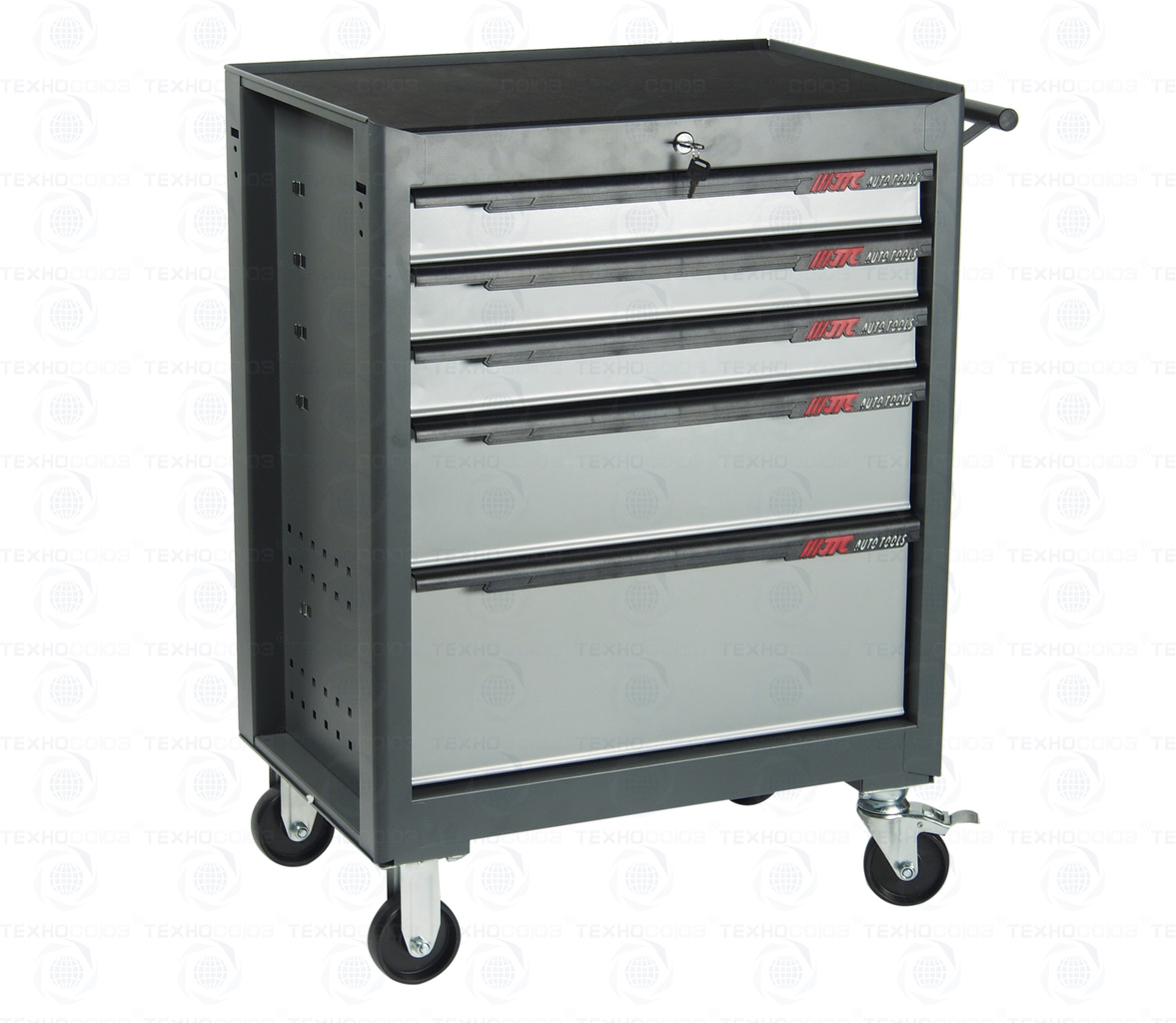 • Перфорированные внутренние стенки боковых ящиков с квадратными отверстиями предоставляют возможность разместить дополнительные аксессуары для хранения инструментов. Применяется с серией подвесных приспособлений JTC-3218.