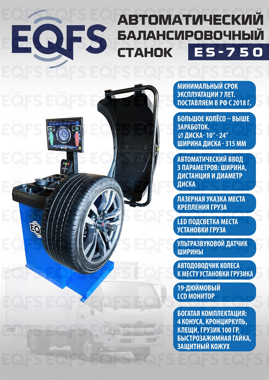 ES-750 Балансировочный станок. Автомат. Для широких колес 315 х R21 от BMW, MB, RANGE ROVER и т.д. Ввод 3-х параметров ( диаметра диска, дистанции и ширины диска), 19-дюймовый LCD монитор с высококачественной 3D-графикой, ультразвуковой датчик ширины. Автодоводчик и лазерная указка места установки грузика. Статическая и динамическая балансировка, ALU-программы для алюминиевых дисков. Программа OPT. Программа разделения и скрытой установки грузиков за спицами SPLIT. Режимы калибровки и самодиагностики. Для балансировки колёс с диаметром колеса до 800 мм. Размеры диска: ширина 3–10” (76-254 мм) , диаметр диска 10–24” (254÷609 мм). Прочный вал Ø - 40мм. Вес колеса 65 кг. Гарантия 18 мес – наш монтаж, 12 мес – самостоятельная установка.