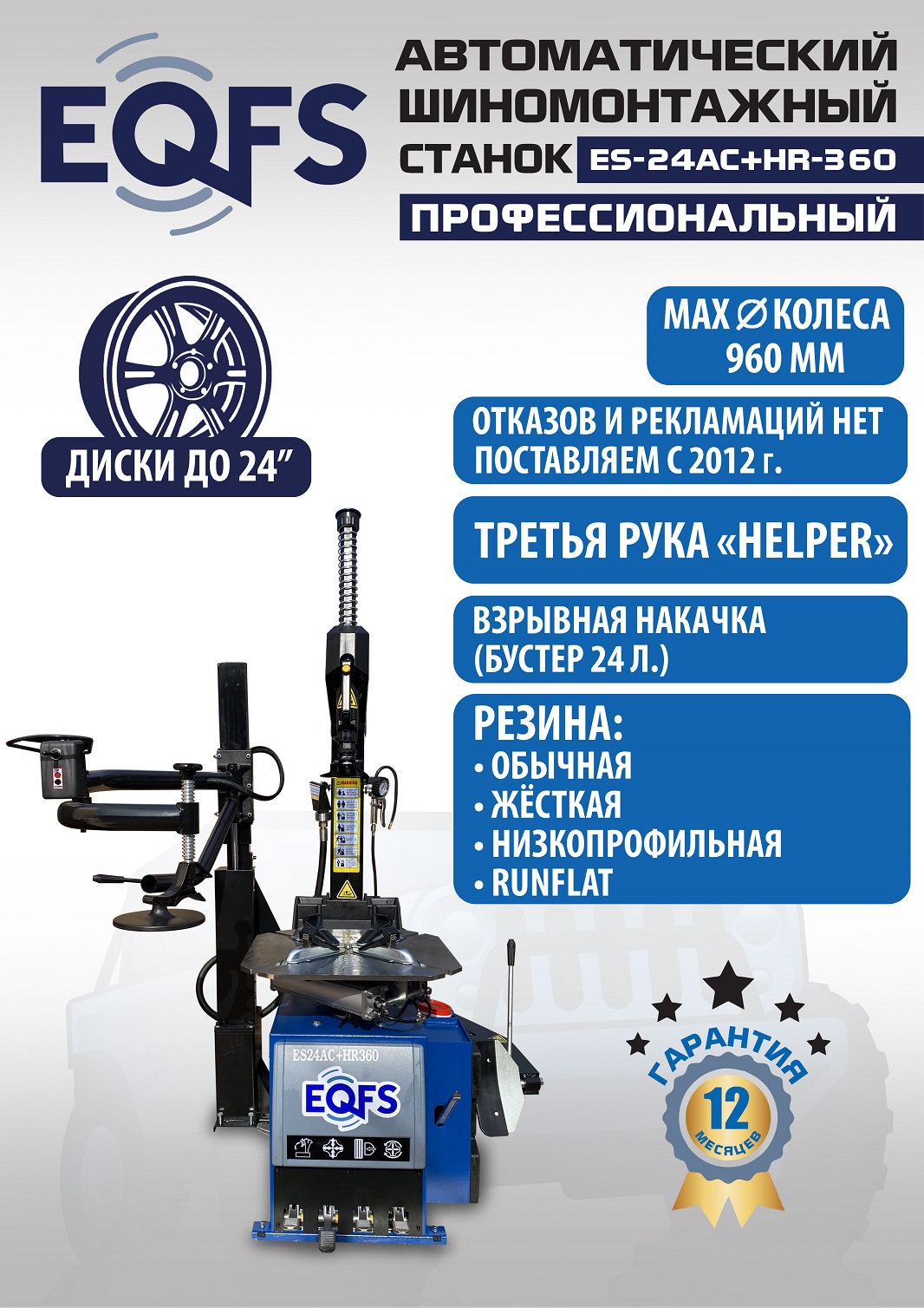 ES24AC+HR-360 Шиномонтажный станок. Автомат. Большой квадратный стол. Для колес с размером от 10-24 дюйма. Усилие отжима увеличено до 2700кг. В комплекте взрывная подкачка + третья рука для работы с низкопрофильными шинами и RanFlat + встроенный бустер  24 литра (взрывная подкачка) + пистолет для подкачки шин + монтажка + регулятор давления с влагоотделителем и манометром.