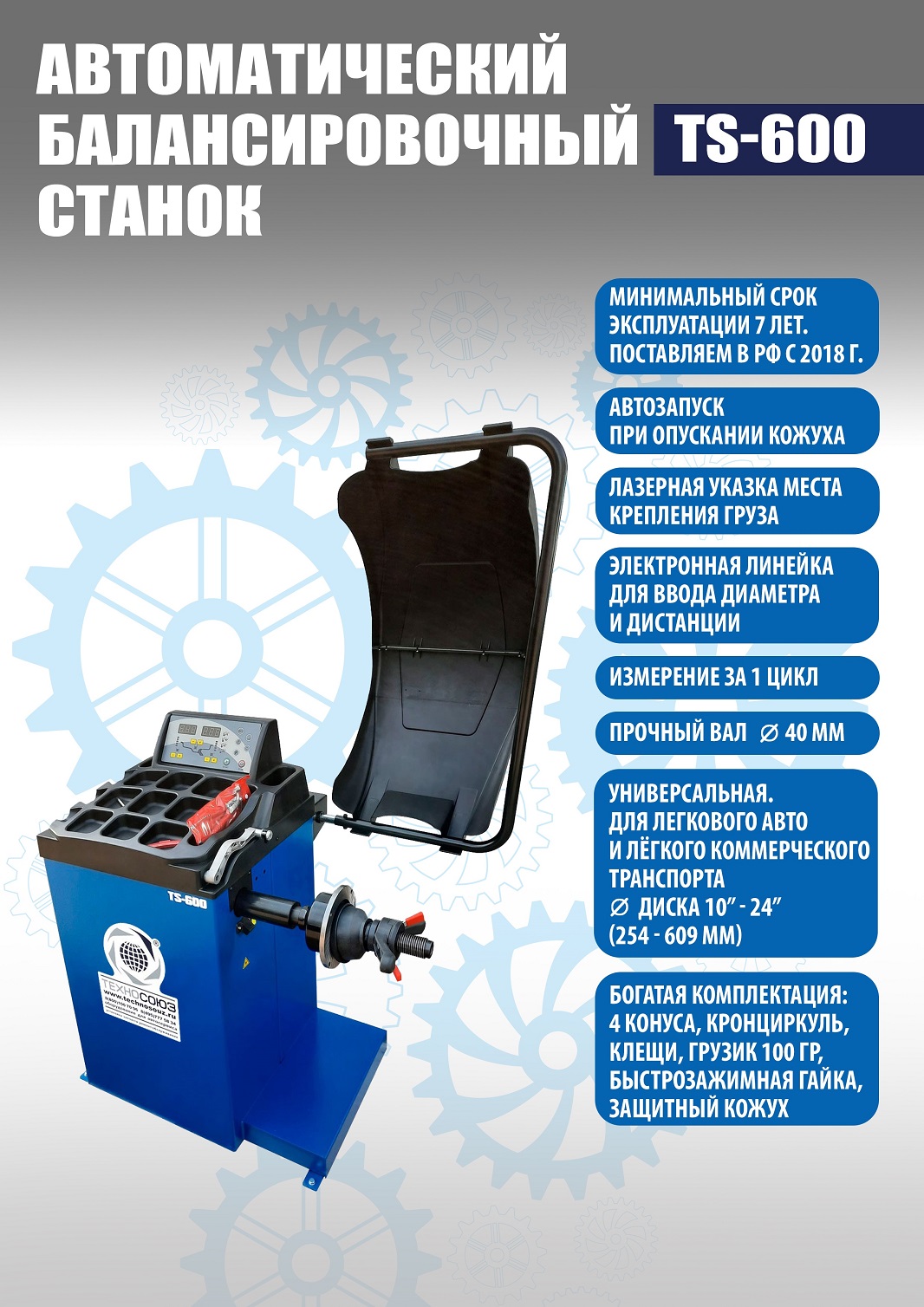 TS-600 Балансировочный станок. Автоматический ввод дистанции и диаметра диска. Остановка и фиксация колеса в месте установки грузика. Лазерная указка места установки грузика на 6 часов. Старт опусканием кожуха или с кнопки. Для колес легковых автомобилей, мотоциклов и легких грузовиков с диаметром диска с резиной до 800 мм. Размеры диска: ширина 3–10” (76-254 мм), диаметр диска 10–24” (254÷609 мм). Вал- 40мм. Гарантия 18 мес – наш монтаж, 12 мес – самостоятельная установка. В комплекте: кожух с автозапуском + клещи + кронциркуль + быстрозажимная гайка + набор конусов.