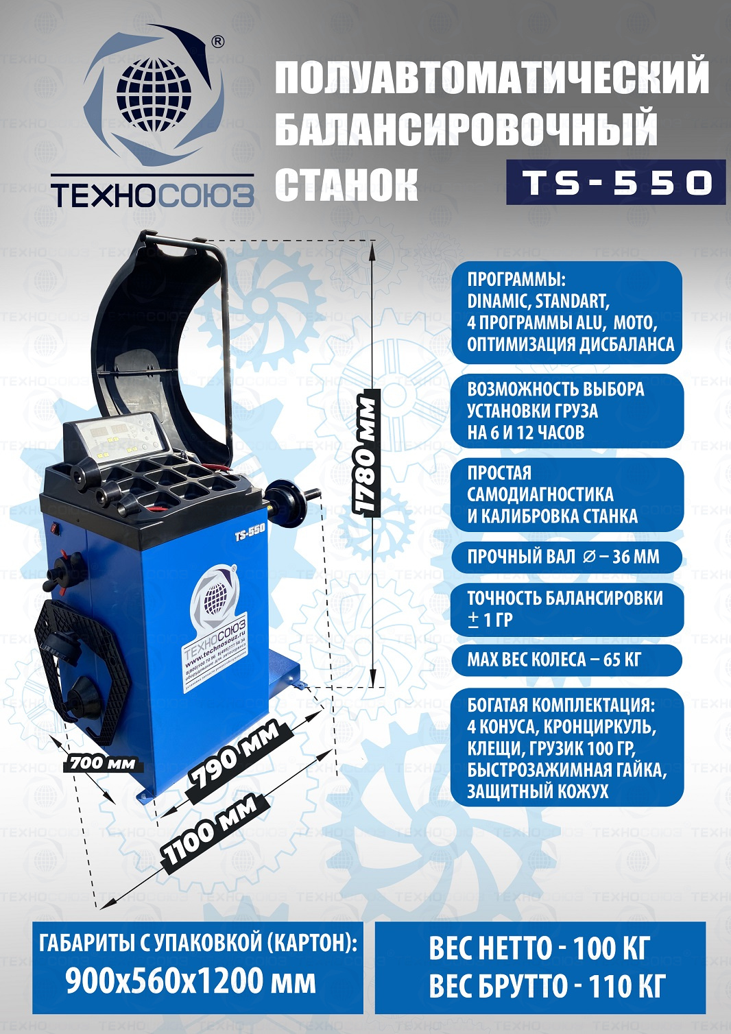 TS-550 Балансировочный станок (с лазером) Полуавтомат. Удобный и понятный интерфейс. Автозапуск опусканием кожуха. Автоматический ввод дистанции и диаметра диска. Лазерная навигация. Автокалибровка. Для колес легковых автомобилей, мотоциклов, «Газелей», «Спринтеров» с диаметром диска с резиной до 800 мм. Размеры диска: ширина 3–10” (76-254 мм), диаметр диска 10–24” (254÷609 мм). Вес ≤ 65 кг. Вал- 36 мм. Точность ±1гр. 220 В. Режимы работы DINAMIC, STATIC, ALU1, ALU2, ALU3, ALUS, ST. Гарантия 12 мес. В комплекте: кожух с автозапуском + клещи + кронциркуль + быстрозажимная гайка + набор конусов.