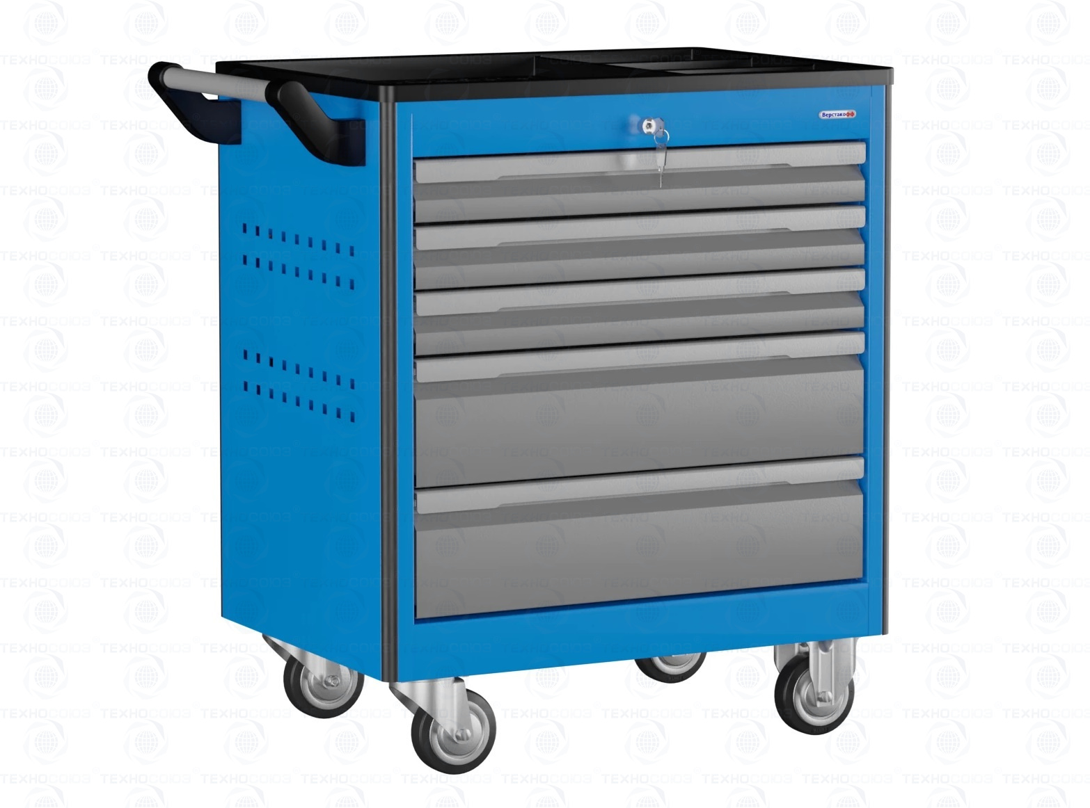Тележка снабжена центральным замком с поворотом ригеля 180 градусов, который закрывает одновременно все ящики. Замок неподвижно и прочно закреплен на корпусе тележки. В комплекте имеется два ключа. Тяга замка подпружинена.