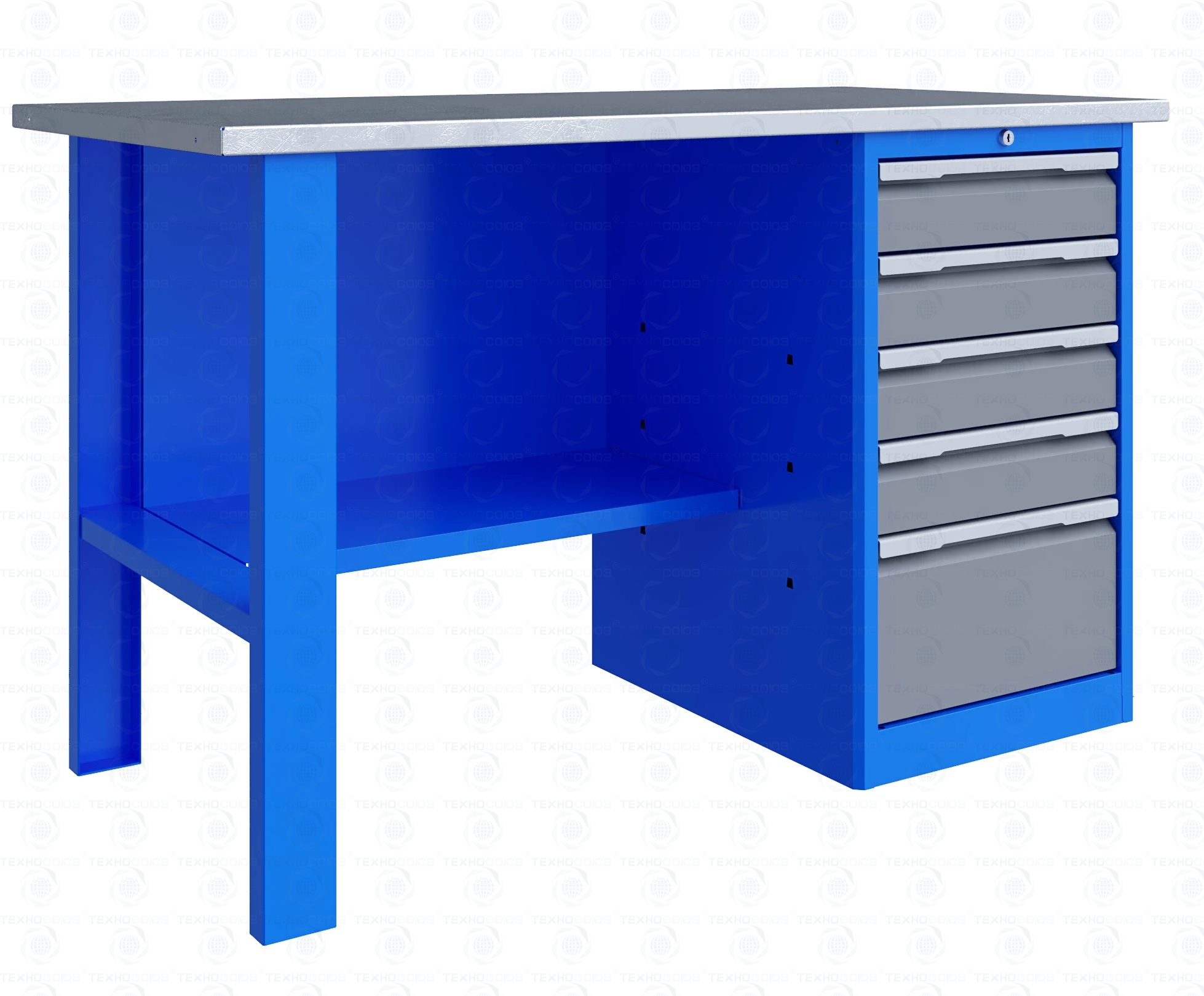 Однотумбовый. Допустимая нагрузка на столешницу 750 кг. Опорные элементы выполнены сварными из холоднокатаной стали. Верстак состоит из столешницы, опоры, тумбы P5 с четырьмя малыми и одним большим ящиком и полки-стенки. Все металлические элементы покрыты полиэфирной порошковой краской. Столешница состоит из фанеры марки ФСФ толщиной 24 мм, которая покрыта лаком-антисептиком и листом оцинкованной холоднокатаной стали толщиной 1,2 мм. Размеры (ВхШхГ) 855x1396x696 мм.